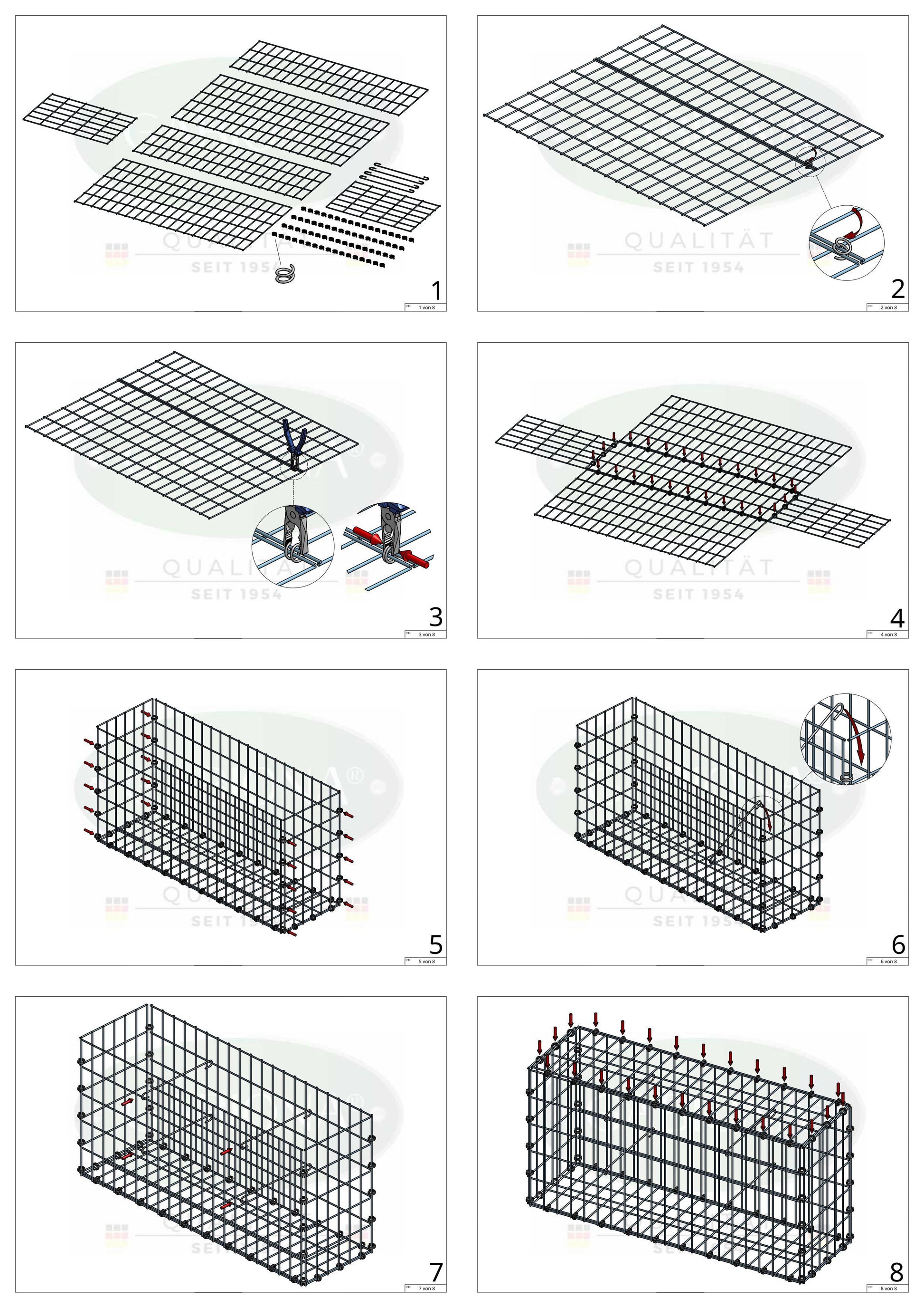 Denne robuste gabion er specielt udviklet til at opfylde de højeste krav til stabilitet, holdbarhed og vejrbestandighed. Konstruktionen er sikkert lukket med flere spiralringe, som er snoet gennem to ledninger og fastgjort på plads med en tang. Dette sikrer nem montering og en særlig stabil forbindelse mellem gitterne.