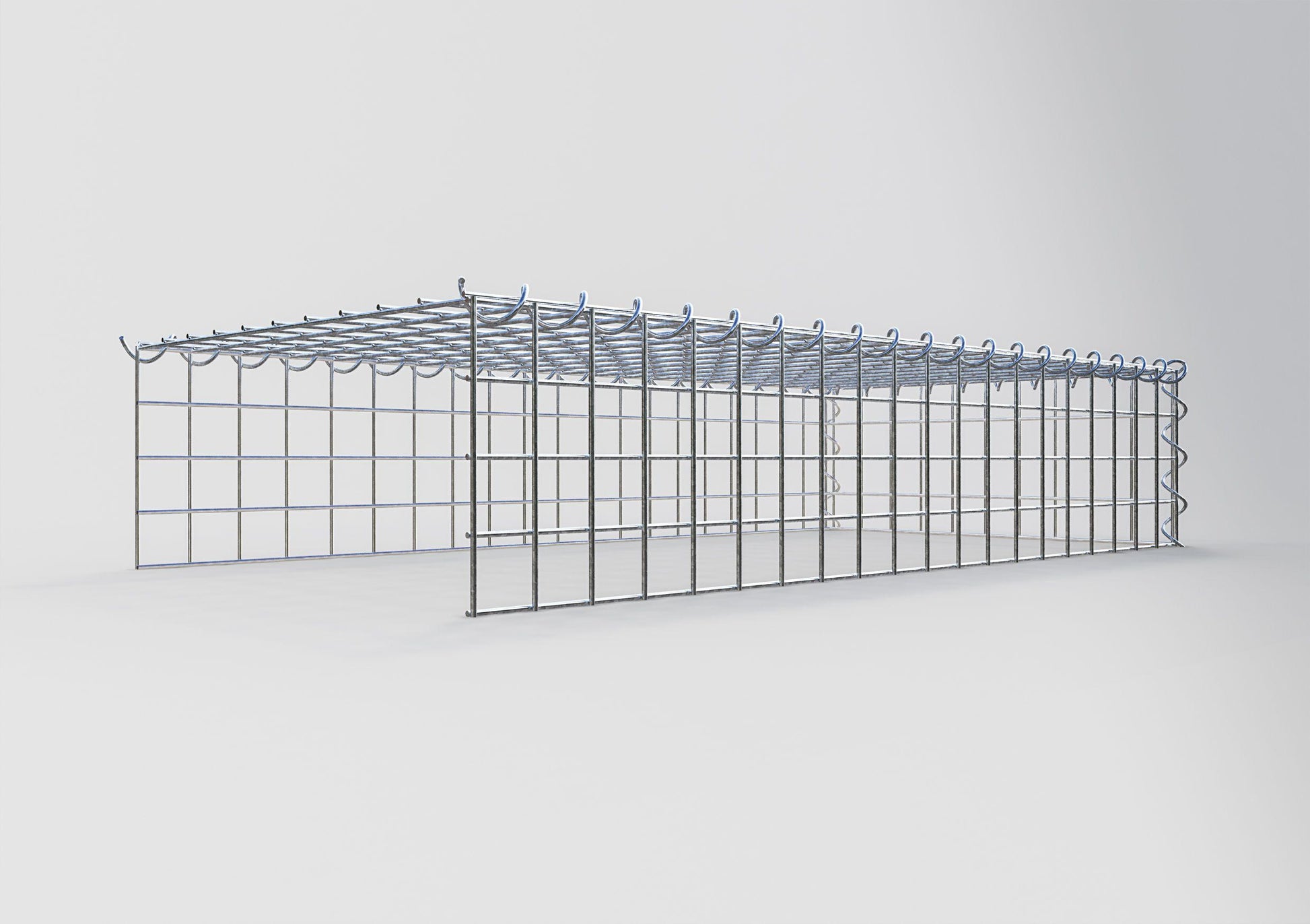 Este gabião não tem grade frontal e inferior. Isso permite que seu gabião cresça tanto em comprimento quanto em altura. Observe que o