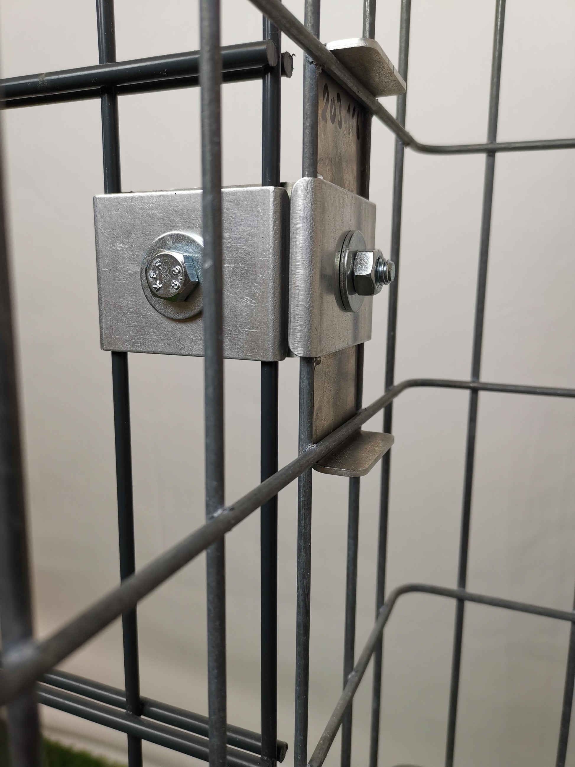 Klämman monteras innan gabionerna fylls. Två till tre klämmor krävs per korgsida, beroende på höjden. I leveransen ingår en galvaniserad klämma med motplatta samt alla muttrar, skruvar och brickor som krävs för monteringen. Nät som visas är endast för demonstrationsändamål och ingår inte i leveransen. Denna artikel är endast lämplig för en maskstorlek på 5 cm x 10 cm.